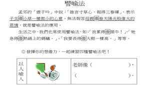此學習單主要是練習「譬喻法」,引導學生利用生活中熟悉的素材做聯想,寫出精采的譬喻句。