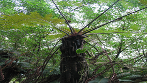 特徵:葉子為三回羽狀複葉或裂葉,葉子老化時,會從近基部處折斷但不脫落,並殘留葉柄於葉幹上,而形成「樹裙」。孢子囊群圓形,在小羽軸的兩側各排成一列,由具有黑褐色的球形苞膜保護者。全株偏深綠色,葉柄與羽軸偏黑褐色,有刺。