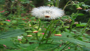 特徵:頭狀花紅褐色,著生頂端,總是彎曲下垂,像有無限嬌羞。莖直立,被粗毛,莖葉柔軟多汁,葉互,長橢圓形。瘦果帶白色冠毛,隨風飛揚,漫天飛舞相當奇特。
