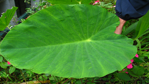 特徵:多年生草本,根莖直立。卵形葉先端三角形,葉面具有白色臘質,葉脈不明顯,葉基部淺凹,葉長約30-40公分,寬約20-25公分,具有長約50-60公分葉柄;花單性,著生於肉質花軸上,佛燄苞花序約15-20公分;漿果紅色,螺旋狀排列。
