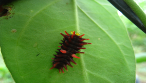 這是一隻黃裳鳳蝶二齡幼蟲,體表有許多突出的肉脊,3.4腹節有一條桃紅色的條紋,十分鮮豔討喜。