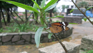 午餐後潔牙,學生發現樺斑蝶在水池邊的馬利筋上產卵。