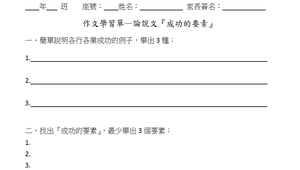 論說文所重在「理」。因此不論是發揮個人見解或駁斥不同說法,必須立場明確、條理分明、理由充分、善用例證才能讓人易於明瞭、接受,乃至於信服自己的理念。藉由本學習單引導學生去蒐集成功的故事,並練習將其所看的故事練習縮寫成五、六十字,讓學生學習經由多個故事歸納整理出成功的要素有哪些,確定自己的寫作立場,進而幫助學生克服習寫『論說文』中善用例證、條理分明的要求。