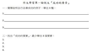 論說文所重在「理」。因此不論是發揮個人見解或駁斥不同說法,必須立場明確、條理分明、理由充分、善用例證才能讓人易於明瞭、接受,乃至於信服自己的理念。藉由本學習單引導學生去蒐集成功的故事,並練習將其所看的故事練習縮寫成五、六十字,讓學生學習經由多個故事歸納整理出成功的要素有哪些,確定自己的寫作立場,進而幫助學生克服習寫『論說文』中善用例證、條理分明的要求。
