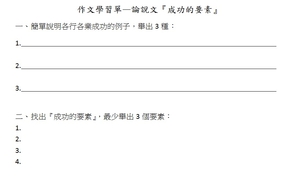 論說文所重在「理」。因此不論是發揮個人見解或駁斥不同說法,必須立場明確、條理分明、理由充分、善用例證才能讓人易於明瞭、接受,乃至於信服自己的理念。藉由本學習單引導學生去蒐集成功的故事,並練習將其所看的故事練習縮寫成五、六十字,讓學生學習經由多個故事歸納整理出成功的要素有哪些,確定自己的寫作立場,進而幫助學生克服習寫『論說文』中善用例證、條理分明的要求。