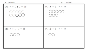「10的合成與分解」概念是學習加減法的重要基礎。本學習單共3頁,依照簡單到困難的順序編寫。先練習「畫 ○ 補成10」的加法,進一步再加上完成分解圖,最後練習以減法的概念畫 ○ 及完成分解圖,循序漸進學習「10的合成與分解」概念。