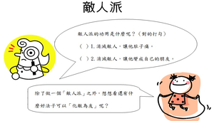 「敵人派」繪本,描述一個小男孩如何在爸爸的協助下化敵為友。在孩子衝突頻傳的國小階段,透過教導他們如何化敵為友,十分具教育意義。