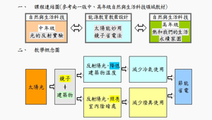 採用生活中容易取得的用品─鏡子。模擬光線照射建築物產生的現象,運用光線照射鏡子反射的原理,讓建築物減少光的直接照射以降低建築物受熱的溫度,再調整鏡子角度將光線反射到建築物內提供室內所需的光,讓學生親自操作找出最適當的方式,來解決上述降低受熱溫度及增加室內亮度的兩個問題。學生從生活資訊及經驗思考解決問題的方法,運用工具進行實驗及探究活動,由活動中獲得新的認知並提出改善周遭環境問題的方法,以達到教學活動的目的。