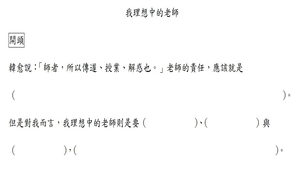 許多人都視作文教學為畏途,許多孩子也害怕寫作,但是其實只要有足夠的引導,孩子就能寫出有模有樣的作文。此學習單以名言錦句開頭,要孩子想出三個理想老師的條件,讓全班學生腦力激盪,想出有什麼條件是十分重要的,並將其寫在黑板,孩子可以從黑板上的眾多條件中挑選三個作為作文材料。當孩子提出條件時,老師可引導孩子說出實例,例如老師要有耐心,請孩子分享他們遇過最有耐心的老師,他做了什麼事讓他們有這樣的感受?最後的結尾,搭配國語課"海倫凱勒的奇蹟"此例子,強化文章中孩子成為理想老師的決心。