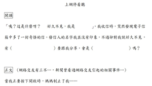 許多人都視作文教學為畏途,許多孩子也害怕寫作,但是其實只要有足夠的引導,孩子就能寫出有模有樣的作文。可以先問問看學生,他們是否收到過或開啟過病毒信件或詐騙信件,請學生分享類似的經驗,以此經驗寫成對話法開頭,增加文章的趣味性。正文可利用全班腦力激盪的方式,請學生說出有聽過哪些網路交友或網路詐欺的新聞事件,並將其寫在黑板,孩子可以從黑板上的眾多條件中挑選三個作為作文材料,更可分享自己親身的經驗。最後,使用打油詩作為結尾。老師可以利用一節課,介紹”張打油”此人,讓孩子練習如何創作俏皮逗趣的打油詩。此學習單是幫助不知如何下筆的孩子有脈絡可循,也可鼓勵聰明的孩子直接修改此學習單,以符合其寫作需求。