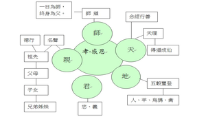 1.由五倫-天、地、君、親、師帶入三綱五常。