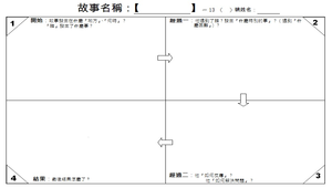 回想自己曾經看過的故事,或自編故事,為故事命一個名稱並找出故事中的四個圖片,分表代表故事的開始、經過一、經過二、和結果。畫出四頁小書。
