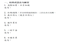 配合南一三上國語課程第三單元【寶貴的時間】,讓學生除了透過課文了解時間的重要之餘,還能依學習單整理的時間成語、佳句、唐詩,來理解時間與求學的習習相關。學生既增添語文程度,又能學習將成語、佳句及唐詩運用於寫作之中,並體會時間的寶貴。