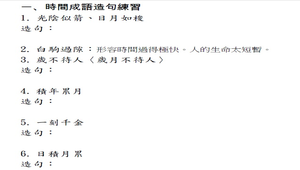 配合南一三上國語課程第三單元【寶貴的時間】,讓學生除了透過課文了解時間的重要之餘,還能依學習單整理的時間成語、佳句、唐詩,來理解時間與求學的習習相關。讓學生既能增添語文程度,又能學習將成語、佳句及唐詩運用於寫作之中,並體會時間的寶貴。