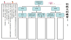 運用學習單的引導讓學生練習記敘文體的習寫,再區分出文章的開頭、經過、結果,採以五感的描述,將地方中令學生最有印象和有趣的事件敘述出來。