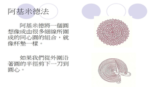 介紹阿基米德如何將圓拆成三角形來計算圓面積。