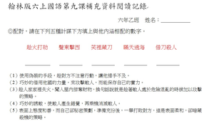 第九課課文描述「草船借箭」的故事,生動活潑,藉著學習單補充「三十六計」中其他五項計策,以配對方式讓學生猜測計策背後的故事,之後再簡單講述故事內容讓學生參考。其次,透過寫作瞭解學生對課文中孔明這個人物的個性與特質的掌握。