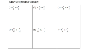 學習內容:N-4-5 同分母分數:一般同分母分數教學(包括「真分數」、「假分數」、「帶分數」名詞引入)。假分數和帶分數之變換。同分母分數的比較、加、減與整數倍。