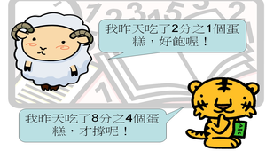 小咩與小虎這系列的投影片本尊,其實是我的兩隻可愛手偶,透過這兩個俏皮的角色,教導學生學習數學,孩子也覺得有趣多了。此投影片主要是透過圖片讓學生了解等值分數的意義。用於此單元的開始。