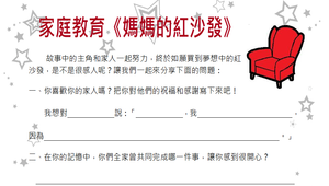 將繪本《媽媽的紅沙發》製作成PPT檔,帶領學生共讀,在閱讀繪本後引導學生回想平時和家人相處的情形,感受家人的喜樂都是一體的,並表達關懷和感謝。再讓學生思考當家中遭遇困難時,可以透過哪些行為減輕家人的負擔,理解家人間要互相體諒、互相支持,才能成就一個幸福的家。