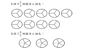 學習內容:N-4-5 同分母分數:一般同分母分數教學(包括「真分數」、「假分數」、「帶分數」名詞引入)。假分數和帶分數之變換。同分母分數的比較、加、減與整數倍。
