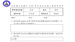 資訊融入教學,利用網路、收尋引擎尋找各地節慶活動相關資料,完成學習單。