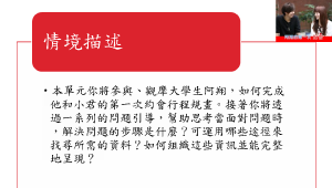透過圖片、文字與Flash動畫的方式,說明阿翔如何邂逅曉君與規劃約會過程的動機等經過,本單元定位學習者為阿翔的輔助者,必須幫助阿翔規劃約會行程。而後以單、複選題的方式,一面詢問學習者規劃行程所需的資料與遇到的問題,刺激學習者思考如何解決問題,一面提供參考的解答。