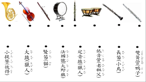 人物與樂器的連結,不同的樂器代表著故事中不同人物的特性