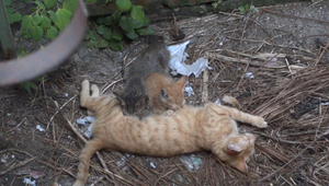 觀察到野貓補乳幼貓的過程,幼貓緊緊依偎在母貓身旁,吸食著母貓的乳汁。