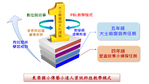 本課程以本校「大士爺信仰文化課程」學校本位課程的發展經驗為基礎,101年度起我們聘請國立臺南大學數位學習科技系林奇賢教授指導,依100年度課程實施歷程與結果加以檢討整,重新構思四年級與五年級的課程實施方式,導入PBL教學模式、數位說故事技術、國科會專案計畫建構的「群學網」雲端平台,提供教師優質的PBL教學模式實施平台,運用資訊科技建構探索課程引導學生。教師群融合「群學網虛擬教室」、「PBL教學模式」、「數位說故事」、引入「家長與社區資源」參與,將以上四大要素與「大士爺信仰文化課程」緊密結合,設計出能有效提升學習成效、能引導學生合作學習與解決問題的各項關鍵能力的「傳藝小達人資訊科技教學模式」。學生在完成任務的同時,能培養發自內心深入欣賞傳統文化的素養,且成為能欣賞在地大士爺信仰文化的「小達人」,培養出愛鄉愛土的情操。