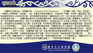 荷蘭的正式國名為「尼德蘭王國」(Kingdom of the Netherlands),「尼德蘭」就是「低地」的意思,一般歷史上所稱呼的「低地國」一詞,其實並非單指荷蘭而已,而是包括了荷蘭、比利時、盧森堡等三國。這些國家的部分土地低於海平面,因而被稱呼成低地國。荷蘭因為有三分之一的土地低於海平面,所以又成為低地國的代表。荷蘭的歷史最早可以追溯到羅馬時期,當時此地區有日耳曼人與賽爾特人的部落分佈,後來被羅馬帝國所統治,西元476年西羅馬帝國滅亡,該地區也落入了日耳曼人的控制。到了西元七世紀,該地區則先後由梅羅文加王朝、加洛林王朝、哈布斯堡王朝所控制,並轉變成為基督教地區。最後在西元1581年宣佈獨立。西元十七世紀為荷蘭的黃金時期,荷屬東印度公司入駐亞洲,統治亞洲的殖民地,取得豐富的自然與人力資源,成為當時歐洲的海上霸主,其首都阿姆斯特丹為歐洲最為繁忙的港口、貿易金融中心。西元十八世紀,荷蘭海軍力量下降,在亞洲的殖民地逐漸被英國所瓜分,荷蘭的國力逐漸下降。法國大革命期間,法國皇帝拿破崙佔領了荷蘭,西元1806年成為了拿破崙控制下的荷蘭王國。第一次世界大戰,荷蘭保持中立。但是第二次世界大戰,則是被德國所佔領。二次大戰結束後,荷蘭於西元1949年加入北大西洋公約組織,也是歐洲經濟共同體的會員之一。目前則是歐洲聯盟的一員。