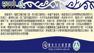 高雄港內,陸路交通四通八達,和水路交通相比,絲毫不會遜色。高雄港自日治時期開始改建成現代化的港口,當時的公路,除了當作道路使用外,也可作為卸貨的碼頭面,長度有2880尺,寬度24尺。貨物自碼頭卸下後,通往各倉庫間的貨物搬運通路有幹線1條,支線10條,貨物的流通十分方便。這是港內的交通動線。通往市區的道路則有2條,亦是寬度達到30尺的大馬路。鐵路方面,共有22線,分別為在碼頭前方有3線,碼頭中央有4線,碼頭後方有8線,6條濱線以及鹽糖高雄工廠專用線1線,總長度將近7哩。今日高雄港內的陸路交通更加便利,尤其是過港隧道的完成,將發展已達十分繁榮的臨港地區和旗津島加以聯合,高雄港日後的發展將更加光明燦爛。