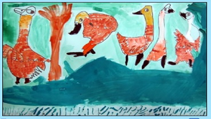 「鵝」是志學牧場裡最霸氣的動物,整天總是大搖大擺神氣的在牧場中閒逛,伴隨著嘎嘎嘎的叫聲響徹雲霄,不論是覓食、喝水、游泳......,雞、鴨、兔們都得禮讓三分,但那份優雅與多變的姿態,卻是與生俱來,誰也模仿不來的。「鵝」引人注目的外形及姿態,正符合了中年級學童的學習創作歷程,因此選定了「鵝」做為本次繪畫的主題。 依據羅恩菲爾(Viktor Lowenfeld)「創造與心智成長理論」中提及,9-11歲的中年級兒童正值「寫實萌芽期」(Dawning Realism Stage),具有簡單的透視概念,開始嘗試將所看到的現實,表現為具體的視覺概念。此時期孩子的繪畫特徵較能描繪細部,注意到空間關係,並且使用重疊的技巧。.對顏色的運用較豐富,且能辨識及表現色彩的變化,不再只是採用固有色。此時期亦具有無比的創作欲望,但也因比較留意作品的成果,亦是「創作的危險期」,常常因為畫得不像而受挫。此時期的孩子,想要畫得更真實,跟自己所看到的世界更接近,但不免犯了「圖示期」孩子的問題,畫的是心中所想的,而非實際所觀察到的。 所以在教學設計上,要如何透過適當的引導,進行正確的觀察,進而運用色彩技巧及學習欣賞作品,是本課程設計最重要的部分。本課程透過賞鵝、識鵝、繪鵝及作品發表的系列活動,讓學生由觀察至描繪上色,在「做中學」中輕鬆的進入快樂的繪畫天地。 教學目標: (一)透過賞鵝活動,引起觀察的興趣。 (二)透過鵝的活動短片解說,了解鵝的活動與姿態。 (三)透過圖片外形分析、解說及引導觀察,了解觀察的方法與重點。 (四)透過上色技巧示範教學,學會用具的使用及技巧的應用。 (五)透過作品發表、教師講評,學習欣賞、自我省察及表達的能力。