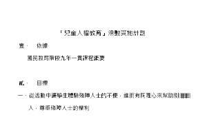 一、從活動中讓學生體驗殘障人士的不便,進而有同理心來幫助別人,尊重殘障人士的權利 二、從活動中讓學生知道自己擁有的權利,並維護自己應有的權利 三、能知道何謂兒童受虐,萬一自己或見到他人受虐時,知道從適當途徑獲得救援 四、理解權利和義務的關係、並能去維護自己權利及更進一步去尊重他人權利