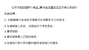 1.知道國慶日的由來及國慶日代表國家生日的意涵。 2.知道國旗上形狀、各顏色所代表的意義。 3.會唱國歌。 4.會幫國旗著上正確的顏色。 5.知道自己是中華民國的國民並愛自己的國家。