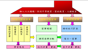 1.能學會自己生活的自理技能,進而學會做家事的能力。 2.能察覺家事需要家人共同分擔,並分擔家中的事物。 3.能實際操作各種家事,表達對家人的感謝。