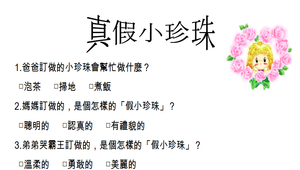 《真假小珍珠》由三個章節組成《訂做的小珍珠》、《神秘的貨來了》、《誰才是真的》。小珍珠是一個小女生的名字;有一天,小珍珠在新開張的夢工廠訂做一個全自動機器人。等待送貨上門的時候,小珍珠卻發現爸爸媽媽和弟弟哭霸王也都分別訂做了 “假小珍珠”。他們對“假小珍珠”的滿意,令小珍珠傷心極了,覺得自己在家裏的地位受到了威脅。而她自己訂做的“乖小珍珠”,則是用來替自己做功課,讓她可以悠閒地溜出家門去玩遊戲機、吃豆花、看漫畫。有一天早晨,“假小珍珠”突然代替小珍珠去上學了,而且還得到了媽媽的特別關心。在兩個小珍珠面前,媽媽傻眼了。經過一番辯解和求證,媽媽終於分清楚誰才是真的,“假小珍珠”也被退回了夢工廠。
