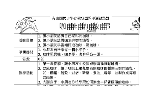 1. 第一類接觸:讓小朋友在校園裡學習種植咖啡樹。 2. 認識咖啡:讓小朋友上網蒐集有關咖啡的種類及製作過程,如:曝曬、脫殼、烘培、研磨,煮法…等等,並製作成海報或簡報。 3. 大顯身手:小朋友分組學習如何泡出一杯香噴噴的咖啡。