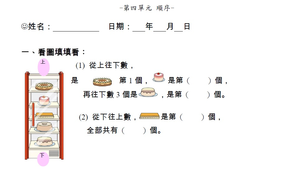 本數學科教案的教學主題是:順序,適用於資源班學生的數學教學, 教學目標為: 一、能在具體情境中,做10以內數的序列 1-1在具體情境中,認識1~10的序數 1-2能用1~10的數詞序列描述某事物在指定的方位所在的位置 1-3能確定某數(1~10)在序列中的位置 1-4能認識基數和序數的關係 二、能積極參與課堂活動 2-1能遵守課堂規範 2-2能踴躍發表