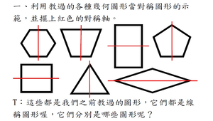 一、教材分析 1.介紹線對稱圖形及對稱軸。 線對稱 在一個圖形裡找到一條線,沿著這條線對摺,這個圖形的兩邊會互相重疊、完全相等,那 麼這個圖形就是線對稱圖形。 對稱軸 在一個圖形裡找到一條線,沿著這條線對摺,這個圖形的兩邊會互相重疊、完全相等,這 條對摺的線就稱為對稱軸。 2.一個線對稱圖形中的對稱軸不一定只有一條。 二、教學方式 1.講述法:教師利用圖片教材,做課程內容的講解。 2.提問法:設計與課程內容相關問題,加深學生對線對稱圖形的印象。 3.討論法:利用小組討論的方式加強學生對課程內容的印象,並做延伸活動。