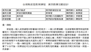 本次教學活動設計係採用案例教學法來設計課程內容,以家庭生活中親子之間常發生的衝突為案例,在案例中融入了設計者的一些想法,以高年級的小朋友為演員,由團隊教師自編自導,利用社團活動或課餘時間來拍攝案例教學影片。冀望透過案例教學的實施與應用,引導學生去探討案例中的深層意義及爭議性的問題,幫助學生思考並探討分析案例問題,期望學生藉由案例討論過程中,能針對案例主角所需的協助,提供自己的看法。