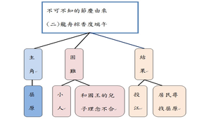 一、以傳統節慶故事引導學生認識相關節日與習俗的由來,培養 學生感恩與尊敬的心。 二、以故事迷宮的方式融入語文與閱讀,一方面引導學生端午節 的由來和屈原的故事,一方面引入閱讀部份,看故事的時候 我們可以從故事的主角、遇到的困難和故事的結果來閱讀。 三、利用浮題樹的方式,讓每位學生所出的題目皆有展現的機會 ,且將樹木分為樹根、蟲蟲和果實,代表一篇故事的主角、 困難和結果,讓學生可以蒐集不一樣的題目。