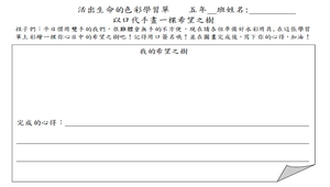 透過謝坤山先生以及楊恩典女士的生命故事,啟發孩子們對殘而不廢的生命價值體認;藉著殘疾體驗,了解殘疾者生活上的種種不便,進一步增加自己面對挫折的忍耐力。