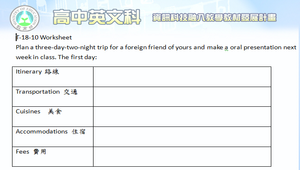 請同學為外國友人規劃台灣三天兩夜的行程,於下一堂課進行英文口頭報告。