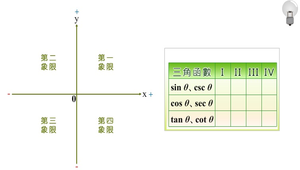 1.以圖形顯示其三角函數於各個象限內的函數值及正負值 2.提供一拖曳題,練習判斷函數值於象限內的正負值為何