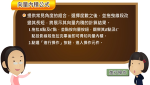 提供常見角度的組合,選擇度數之後,並拖曳線段改變其長短,將展示其向量內積 的計算結果