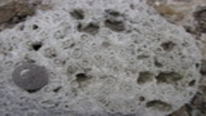 由珊瑚蟲等腔腸動物分泌的碳酸鈣所構成的殼體,長時間積聚後即形成巨大的珊瑚礁。圖為野柳岬所見的珊瑚礁碎塊,由波浪作用沖至海灘上。