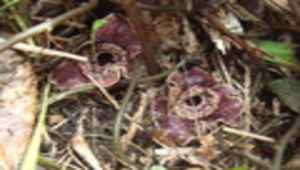 大花細辛別名大屯細辛、小花細辛、白斑細辛、馬蹄香。多年生草本,葉互生、長橢圓狀三角形,上表面灰綠色,有白斑並有疏毛,下表面紫色,花苞從基部長出,花萼呈紫褐色,鐘形三裂,內有密毛。本種為特有種,主要分布於北部山區海拔50~900公尺之山區,生育地通常在背陽面山區稜線林下或溪流旁林底等潮溼處,?愛陰涼環境,植群通常聚生,花季3~5月。