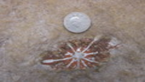 俗稱沙錢,常見於淺海陸棚的沉積環境,在野柳部分出露的砂岩層中可見海膽化石。圖為被褐鐵礦沉澱置換而呈紅褐色的海膽化石,抗風化相對較強而凸出於砂岩表面。