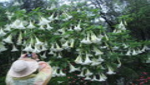 大花曼陀羅株高2-4公尺。葉互生,卵狀長橢圓形,全緣,葉面粗糙.有毛。春季開花,腋生,碩大而下垂,花冠喇叭狀,白色,有如優雅的白紗折裙禮服,並具淡淡芳香,適合庭園露地栽培。